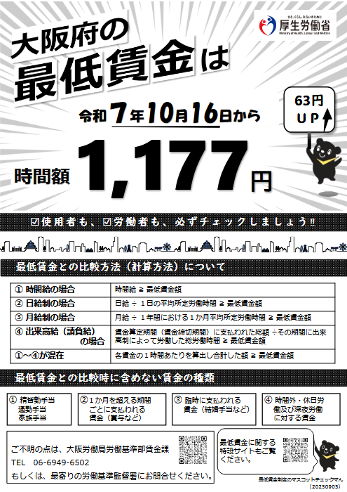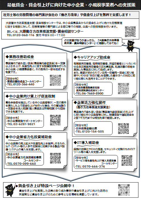 大阪府の最低賃金改正 2025年9月26日 最終更新日時 : 2025年9月26日 tyconsulting 最低賃金引上げに向けた中小企業・小規模事業者への支援策・業務改善助成金・中小企業向け賃上げ促進税制・中小企業省力化投資補助金・キャリアアップ助成金・企業活力強化貸付・IT導入補助金